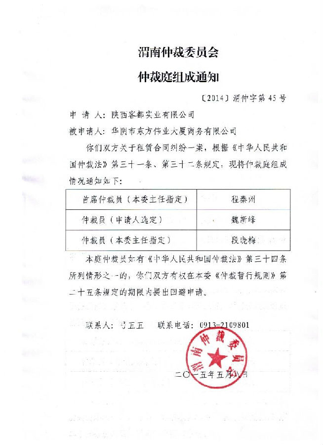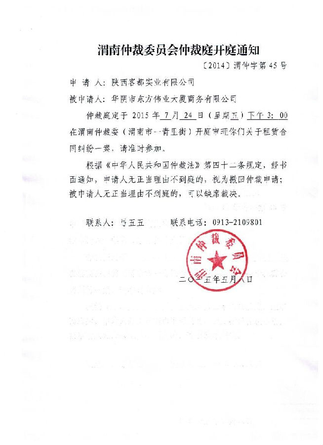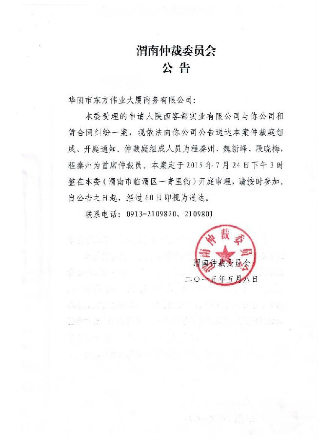 [2014]渭仲字第45號(hào)案件組、開庭通知及公告