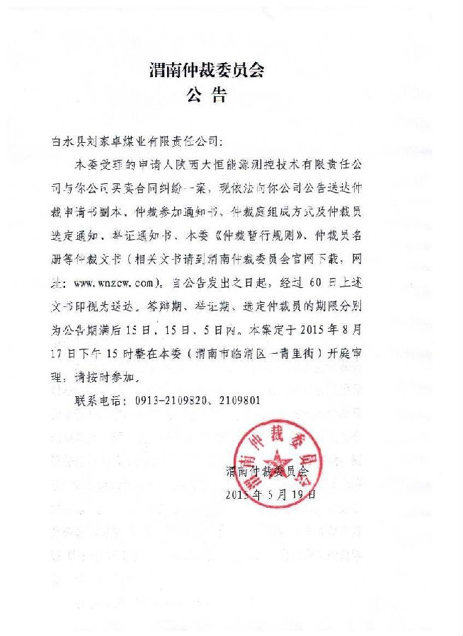 陜西大恒能源測控技術(shù)有限責任公司與白水縣劉家卓煤業(yè)有限責任公司買賣合同糾紛一案公告