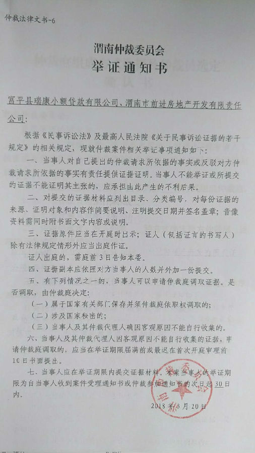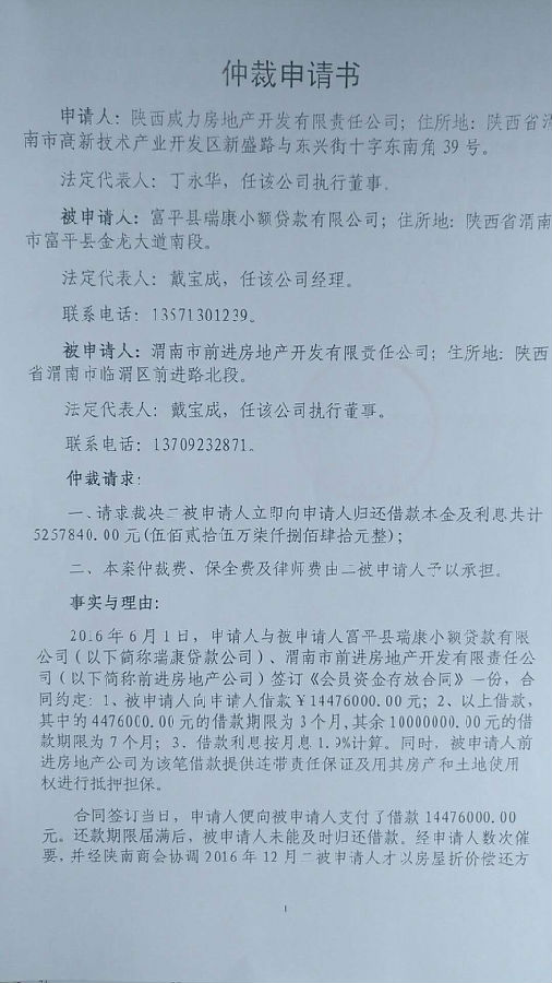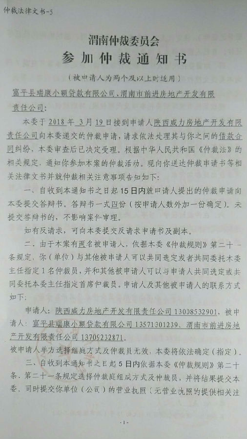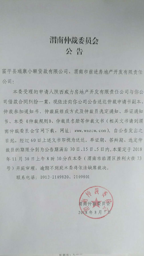 陜西威力房地產(chǎn)開發(fā)有限責(zé)任公司與富平縣瑞康小額貸款有限公司、渭南市前進房地產(chǎn)開發(fā)有限責(zé)任公司一案公告