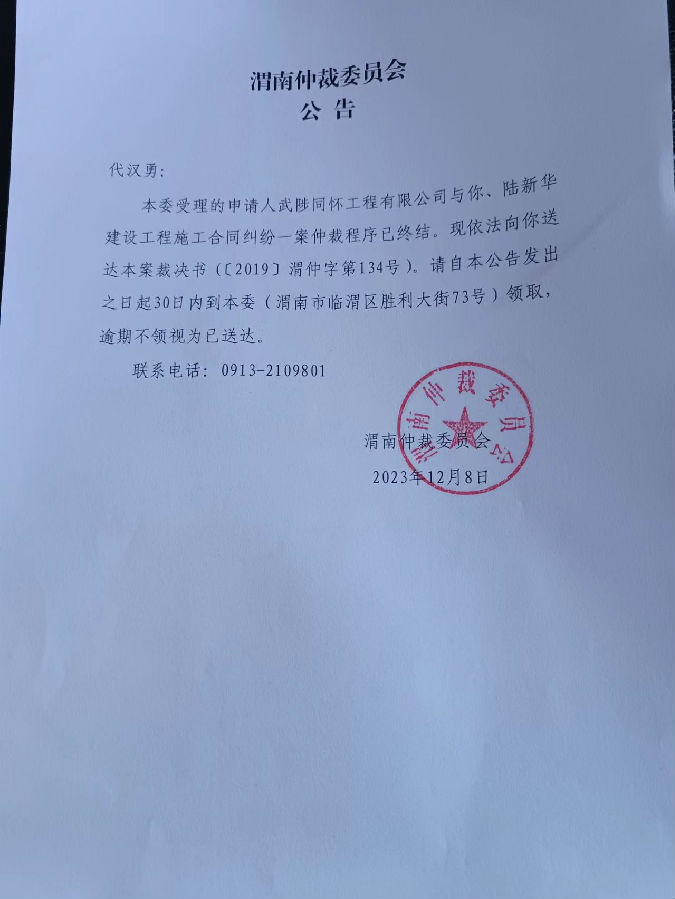 武陟同懷工程有限公司與陸新華、代漢勇一案公告