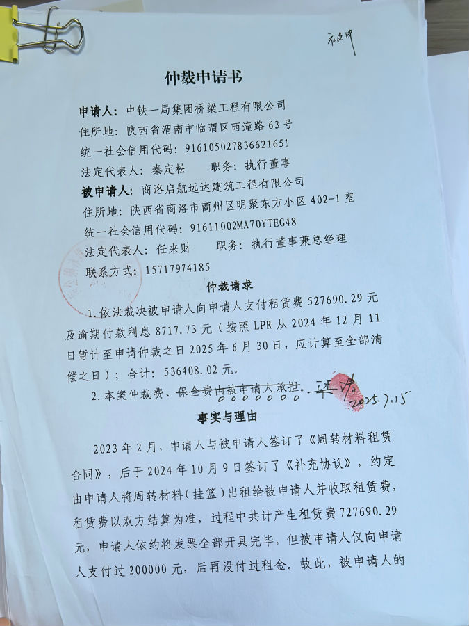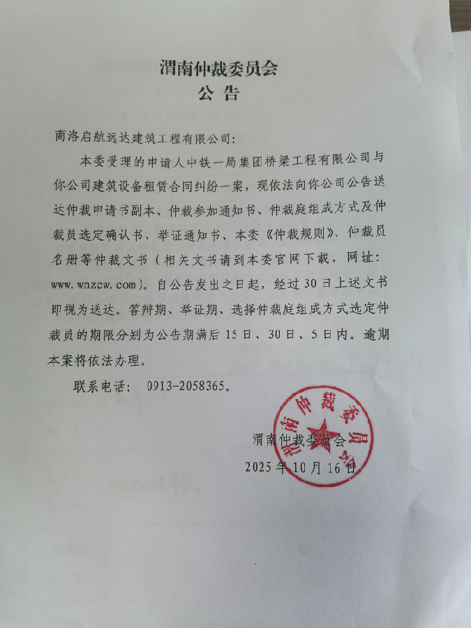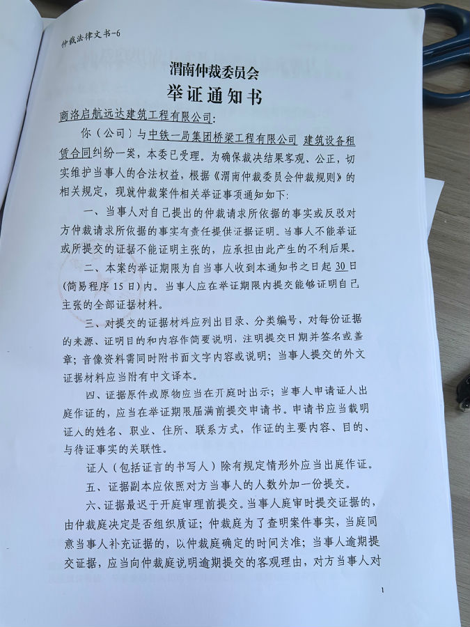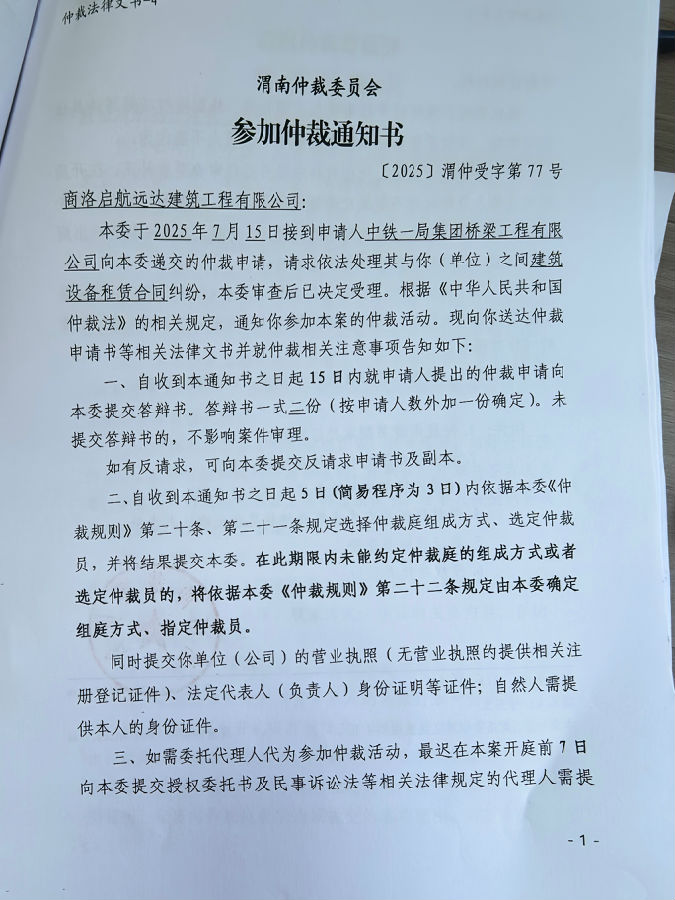中鐵一局集團(tuán)橋梁工程有限公司與商洛啟航遠(yuǎn)達(dá)建筑工程有限公司建筑設(shè)備租賃合同糾紛案公告
